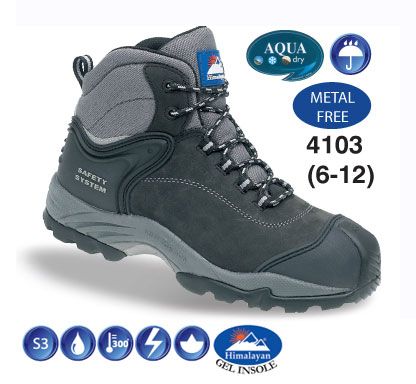 Upper Black Nubuck waterproof genuine cow leather with strong mould rubber toe with Double channel stitching, durability and long lasting resistance Collar Soft padded nylon collar Tongue Nylon soft comfort Lining Mesh with better wicking with WATERPROOF bootie construction Eyelet Strong plastic eyelet Cap EN ISO 20345:2004 standard Non metallic toe cap - with 200 joules for Impact and 15,000 Newtons Compression Reduce cold, Less weight Midsole EN ISO 20345:2004 standard Non metallic Anti-penetration midsole with 1,100 Newtons penetration Footbed Original Cambrella removable footbed with Gel heel cushioning insert - Shock impact absorption, long lasting Outsole Gravity II Triple density outsole / Phylon ~ Anti-Torsion System ~ Rubber Medium hardness phylon offer the extreme shock-absorption, for good cushioning and reduce weight plus more comfort feeling to your feet. Stabilizer arch provides and idea balance of the stability and more durable.Nitrate rubber, oil and 300°C heat resistant, better grip, good flex point High abrasion resistant, durable, "ERP" - Extreme Rubber Protection design